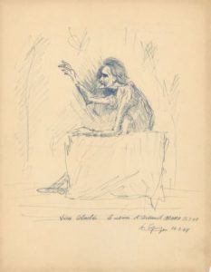 [ARTAUD Antonin]. ESPINOUZE Henri. VIEUX COLOMBIER LE RETOUR D'ARTAUD. DESSIN ORIGINAL SIGNÉ. 1947. 26,5 x 21 cm. Dessin original à l'encre bleue représentant Artaud titrée le Retour d'Artaud Momo, daté et signé au recto par Espinouze alors compagnon de Youki Desnos.