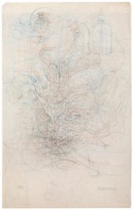 BELLMER Hans. Visage. Dessin ORIGINAL À la mine de plomb et crayons de couleurs, signÉ, 1952. 16,5 x 10 cm, sous emboitage de plexiglass. Dessin à la mine de plomb et aux crayons de couleur sur papier représentant un visage évoquant la mort. Provenance : - Galerie Andre-François Petit, il est joint inséré dans l'emboitage un certificat de André-Francois Petit daté de 1993