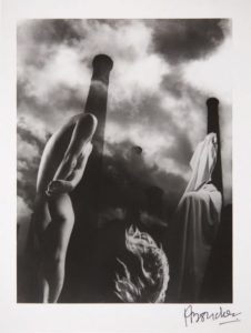 BOUCHER Pierre. NU ET CHEMINÉES. PHOTOMONTAGE ORIGINAL SIGNÉ. 30,5 x 23,5 cm, sous passe-partout. Tirage argentique signé au recto par Pierre Boucher daté par lui au verso avec son tampon : « cliché de 1934, épreuve tirée par l'auteur en 1991 », représentant un corps de femme nue en torsion et un personnage entièrement drapé devant des cheminées d'usine.