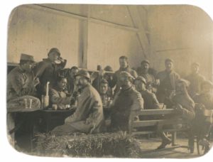 [BRETON André]. PHOTOGRAPHIE ORIGINALE circa 1915. 7,5 x 10 cm. Tirage argentique d'époque représentant André Breton (vraisemblablement à Pontivy) en militaire debout et casqué parmi d'autres soldats dans une caserne. Cette photographie originale d'époque sur carte postale a été réduite aux angles par Breton lui-même et conservée rue Fontaine. Provenance : - Vente André Breton, 2003 sous le numéro 5090