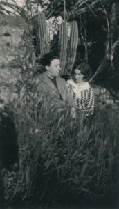 [BRETON André]. ANDRÉ BRETON ET VALENTINE HUGO. PHOTOGRAPHIE ORIGINALE circa 1931. 14 x 8,3 cm. Tirage argentique d'époque représentant André Breton et Valentine Hugo alors amants dans un décor tropical, devant des cactus. Indication au verso au crayon de la main de Breton en vue de la publication de cette photographie.