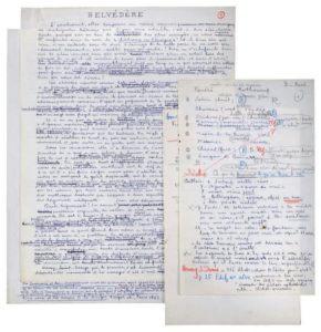 BRETON André. BELVÉDÈRE. MANUSCRIT AUTOGRAPHE SIGNÉ. 21-25 octobre 1962. 2 pages in-4 et 2 pages in-8. Manuscrit autographe de premier jet avec de nombreuses ratures et corrections, relatif aux inspirés et à leurs demeures. ... Les artistes réputés comme tels ont depuis toujours dominé ce problème, quitte à se tromper du tout au tout, ils s'inscrivent dans une cohorte à laquelle du moins, n'est pas refusé tout droit de cité vaille qui vaille et dussent certains d'entre eux subir l'incompréhension ou la misère, ils planent au-dessus de leur sort et quoi qu'il advienne - suicide compris- l'appel au jugement de la postérité leur tient lieu de recours en grâce ... ... ceux qui s'avancent ici ne défient pas moins ingénument l'aberration au regard du sens commun. Ne serait-ce que leur propension à l'autisme qui va de pair avec le souci de projeter sur le plan physique... ... On sait que dans le domaine de la peinture c'est le cas d'autodidactes de génie tels que Henri Rousseau, Séraphine Louis, Morris Hirshfield qui se trouvent ainsi rappelés à leurs conditions subalternes. Il est joint 2 pages in-8 de notes autographes d'André Breton relatives à Belvédère, à l'encre et aux crayons de couleurs. Provenance : - Vente André Breton, 2003, n°2509, sous chemise de la vente