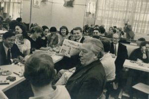 CARTIER-BRESSON Henri. ANDRÉ BRETON ET LE GROUPE SURRÉALISTE. PHOTOGRAPHIE ORIGINALE. Paris, Café La promenade de Vénus, 1961. 19,5 x 29,5 cm, sous passe-partout. Tirage argentique d'époque de Cartier-Bresson représentant André Breton parmi le groupe surréaliste amusé de voir Alain Joubert lui montrer la une de Paris Presse l'Intransigeant titrant : Debré lance le plan Breton. Tampon de Henri Cartier-Bresson au verso.