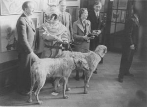 [DALI Salvador]. SALVADOR DALI, PAUL ET NUSCH ELUARD. PHOTOGRAPHIE ORIGINALE. 1937. 12 x 16 cm. Célèbre tirage original d'époque représentant, à l'exposition internationale du Surréalisme à Londres en 1937, Paul et Nusch Eluard et Salvador Dali dans le scaphandre tirant des chiens en laisse, au risque de s'étouffer. Tampon Graphic Photos Union London au verso.