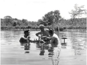 [DUCHAMP Marcel]. RICHTER Hans. MARCEL DUCHAMP, LARRY EVANS ET HANS RICHTER. PASSIONATE PASTIME. PHOTOGRAPHIE ORIGINALE SIGNÉE. 1958. 9,5 x 13 cm, sous passe-partout. Tirage argentique d'époque d'Hans Richter représentant Marcel Duchamp, Larry Evans jouant aux échecs dans l'eau pendant le tournage du film de Richter Dadascope 1956-1961. Signé à l'encre au verso par Richter (petite tache rouge). Tampon de Richter.