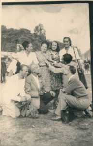 [ELUARD Paul]. PAUL ELUARD ET DIANE DE RIAZ. 6 PHOTOGRAPHIES ORIGINALES. Marseille, Golf Juan, 1948, environ 11,5 x 16 cm. Six tirages originaux d'époque sur papier Veloz représentant Paul Eluard et Diane de Riaz, personnage étonnant, trapéziste et poète. Une des photographies datée Marseille, 1948 au verso par Eluard représentant Eluard, Diane de Riaz et d'autres amis est reproduite page 296 dans la pléiade.
