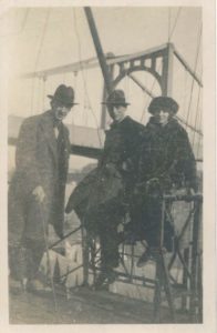[ERNST Luise]. MAX ERNST, PAUL ELUARD ET GALA. PHOTOGRAPHIE ORIGINALE [Cologne, 1921]. 13,5 x 8,5 cm. Tirage original d'époque de Luise Ernst, première femme de Max, sur support carte postale représentant Max Ernst, Paul Eluard et Gala devant le pont suspendu du Heumarkt à Cologne en 1921. En octobre 1921 Eluard et sa femme Gala se rendent à Cologne pour rencontrer Max Ernst. Malheureuse rencontre sentimentale pour Eluard, Gala deviendra la maîtresse de Max Ernst, qui divorcera de Luise. Rare document.