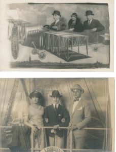 VALENTINE HUGO, RAYMOND RADIGUET, JEAN HUGO. PHOTOGRAPHIE ORIGNALE [1921], 9 x 14 cm. Célèbre tirage argentique d'époque sur support carte postale représentant Valentine Hugo, Raymond Radiguet, et Jean Hugo dans un décor de paquebot au Magic city, premier parc d'attractions parisien.