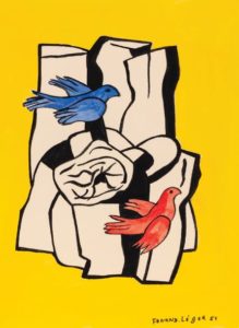 LÉGER Fernand. DEUX OISEAUX. GOUACHE ORIGINALE SIGNÉE. 1951. 31 x 22,5 cm, sous passe-partout. Gouache originale signée et datée 51 au recto par Fernand Léger sur fond jaune représentant un oiseau rouge et l'autre bleu. Un certificat du Comité Léger sera remis à l'acquéreur.