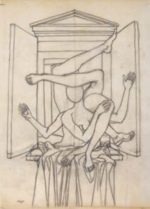 MAYO Antoine Malliarakis dit. DEUX DESSINS ORIGINAUX SIGNÉS SUR PAPIER CALQUE. Le premier au crayon signé au recto, représente deux corps avec bras et jambes en position acrobatique, devant un autel. 47 x 30 cm. Le second à l'encre signé représente un personnage contorsionniste sur une chaise 34 x 19,5 xm