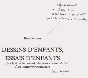 MICHAUX Henri. DESSINS D'ENFANTS, ESSAIS D'ENFANTS. [Paris], Gallimard, 1982. Edition originale constituée par le tirage à part du n°21 de septembre 1982 de Débat, revue intellectuelle française fondée en 1980 par l'historien Pierre Nora, et tirée à petit nombre Exemplaire de Diane Fiori portant un envoi autographe signé de Michaux : Affectueusement à Diane Fiori qui sait mieux ce que c'est que d'être attentif à l'autre... DESSINS D'ENFANTS, ESSAIS D'ENFANTS et essai d'un auteur chercheur à sortir de soi Henri Michaux. Exemplaire comportant de nombreuses corrections autographes de Michaux.
