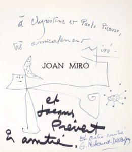 [MIRO Joan]. PRÉVERT Jacques. RIBEMONT-DESSAIGNES Georges. JOAN MIRÓ. Maeght, 1956. Petit in-4 carré, couverture illustrée par Miró. Édition originale illustrée de lithographies originales en couleur de Miró. Exemplaire de Christine et Paolo Picasso portant un envoi autographe signé et illustré d'un dessin original à l'encre de Miró, également dédicacé et signé au feutre par Jacques Prévert et au stylo à bille par Ribemont-Dessaignes.