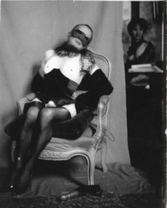 MOLINIER Pierre. AUTOPORTRAIT AVEC LOUP. PHOTOGRAPHIE ORIGINALE. 12,7 x 10,2 cm. Tirage argentique d'époque, autoportrait de Molinier assis, avec loup et l'éperon d'amour au pied du fauteuil. Indications au verso au crayon de Molinier.