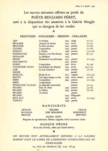 [PÉRET Benjamin]. Affichette typographiée du 8 juillet 1947 à Paris : « Les œuvres suivantes offertes au profit du poète Benjamin Péret, sont à la disposition des amateurs à la Galerie Maeght qui se chargera de les vendre ». 27 x 21 cm. Suit la liste des œuvres proposées d'œuvres d'Arp, Bellmer, Calder, Miro, Paalen, Picasso, Tanguy... des manuscrits et un masque « nègre ». La vente de ces œuvres devait permettre à Péret, alors au Brésil, de revenir en France. [PÉRET Benjamin]. Comme. Catalogue de l'exposition éponyme à la galerie Jean Bard, 27 rue du Petit-Musc Paris IV. Juin 1947. In-8 en feuilles, 29 pages. Œuvres de Bédouin, Bouvet, Caceres, Cuvillier, Demarne, Kujawski, Lelio, Meunier, Puel, Serpan, Tarnaud. Photomontage de Jorge Caceres en couverture et introduction de Maurice Baskine. Mise en page de Benjamin Péret.
