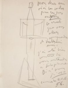 PICASSO Pablo. LETTRE AUTOGRAPHE SIGNÉE AVEC DESSIN ORIGINAL AU CRAYON à son fondeur Antoine VALSUANI. Cannes [La Californie], novembre 1956. 26 x 20,5 cm, sous passe-partout (légères pliures et marges un peu froissées). Picasso s'adresse au début de la lettre au socleur de la fonderie et l'illustre d'un croquis de sculpture avec son socle pour l'exécution en bronze : Mon cher ami, voici les socles pour les deux sculptures je crois que vous allez comprendre A Valsuani ami j'ai été bien content de vous entendre à téléphone bien à vous Picasso Cannes le 20 11 56.