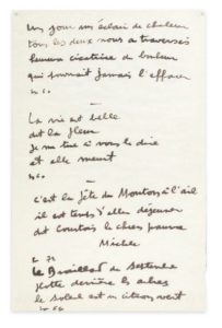 PRÉVERT Jacques. 4 CITATIONS AUTOGRAPHES AU FEUTRE. [1950]. 43 x 28 cm, sous encadrement. 4 citations publiées dans l'édition originale de Spectacle chez Gallimard en 1951. Prévert précise les pages dans lesquelles figurent les citations. Provenance : - Ancienne collection René Bertelé.