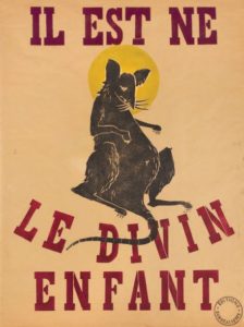 Toyen. Il est né le divin enfant, AFFICHE. 1951. 65 x 48 cm, sous encadrement marqué du tampon « Éditions surréalistes ». Très rare affiche tirée à une dizaine d'exemplaires seulement, réalisée au pochoir par Toyen et marquée du tampon « Éditions surréalistes, représentant une rate à la tête nimbée et au ventre ballonné.