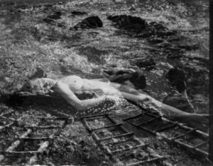 UBAC Raoul. AGUI. SURIMPRESSION. PHOTOGRAPHIE ORIGINALE. 1938. 9 x 12 cm, sous passe-partout (chiffre au verso à l'encre). Tirage argentique d'époque de Raoul Ubac représentant Agui sa femme, couchée nue sur un fond marin. Note autographe d'Ubac au crayon au verso : Nu 1938 surimpression. Rare.