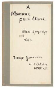 YAMANAKA Tiroux. ASPECTS DU NO Raku. Kyoto, Kyoto Senshokuhan, 1930. Album in-folio, couverture cartonnée à ruban, emboîtage triptyque à la japonaise. Edition originale illustré de masques No à pleine page du musée du Palais impérial de Kyoto. Exemplaire de Paul Eluard portant un envoi autographe à pleine page du surréaliste japonais Tiroux Yamanaka : à Monsieur Paul Eluard bien sympathgiquement vôtre Tiroux Yamanaka le 12 octobre 1933. A toute épreuve est l'ouvrage qui a inspiré Pierre-André Benoit pour réaliser ses minuscules.