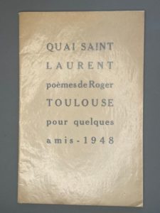 TOULOUZE Roger. QUAI SAINT LAURENT. PAB, 1948. In-4, agrafé, 24,3 x 16,7 cm. Edition originale …