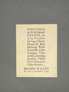 SEUPHOR Michel. PEINTURE FRAICHE DE PICABIA. 1950. In-12, en feuilles. Catalogue des œuvres de 1948 de Picabia et invitation pour l'exposition à la Galerie des Deux Iles à Paris, du 15 novembre au 4 décembre 1950, texte de Michel Seuphor. SEUPHOR Michel. PEINTURES DE H.M. BERARD. DESSINS DE ARP, PICABIA, etc. [PAB], 1950. In-16, en feuilles. Edition originale, catalogue d'exposition au Musée d'Alès du 5 au 15 novembre 1949, illustration de Hartung. SEUPHOR Michel. 4 QUACSTCHATRIDES POUR CENT PERSONNES SPIRITUELLES. PAB, 1950. In-4, en feuilles, 22,9 x 16,2 cm. Edition originale illustrée par Pierre-André Benoit et tirée à 100 exemplaires.
