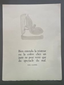 CLAUDEL Paul. BIEN ENTENDU LA TRISTESSE. PAB, 1951. Un feuillet in-folio. Edition originale, tirée à petit nombre illustrée d'un dessin original au crayon signé par PAB. CURÉ D'ARS. PETIT SERMON. PAB, 1951. 5,3 x 5,3 cm. Tirage à 122 exemplaires.