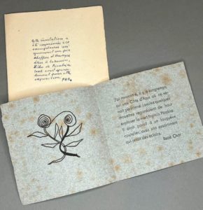 PICABIA Francis. ASSORTIMENT DE DESSINS DE PICABIA. PAB, 1952. 2 feuillets in-16. Edition originale tirée sur papier bleu volontairement choisi par PAB pour ses rousseurs. Texte de René Char. Lithographie de Picabia et texte autographe signé de PAB, en couverture.