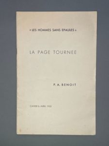 BENOIT Pierre-André. POINT DE MIRE. PAB, 1953. 3 x 3 cm. Edition originale relative à Joan Miró. Un des 35 exemplaires signés par Pierre-André Benoit. BENOIT Pierre-André. SUR SA TOILE. PAB, 1953. 4,5 x 4 cm. Edition originale consacrée à Leopold Survage limitée à 19 exemplaires. BENOIT Pierre-André. LA PAGE TOURNÉE. Collection Les Hommes sans épaule [Jean Breton et Hubert Bouziges]. 1953. In-4, agrafé. Edition originale tirée à 123 exemplaires.