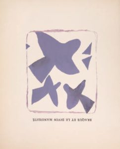 BRAQUE Georges. BENOIT Pierre-André. BRAQUE ET LE DIVIN MANIFESTÉ. PAB, 1959. 28 x 22,5 cm. Edition originale illustrée de 2 pochoirs en couleurs de Braque. Un des 300 exemplaires sur Arches signés par l'auteur. BENOIT Pierre-André. POUR LE XIII MAI MCMLVII. PAB, 1957. Deux feuillets, 25 x 19,6 cm. Edition originale éditée à l'occasion du 75e anniversaire de Braque. Tirage à 9 exemplaires sur auvergne teinté.