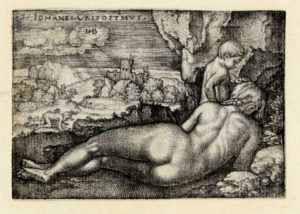 Incisione tratta nello stesso verso da invenzione di Barthel Beham. Con la scritta "S. IOHANES CRISOST°MUS" e il monogramma sulla lastra in alto a sinistra. Bellissima prova nell'VIII e definitivo stato con il monogramma e dopo l'aggiunta dei raggi nelle nuvole, stampata con segno pieno e bel contrasto su carta vergellata sottile priva di filigrana.