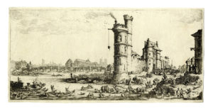 Jacques CALLOT, Vue du Pont-Neuf. — 1630 [tiratura fine XVIII secolo]. — Acquaforte. — mm 164x336. — Foglio : mm 168x342.
