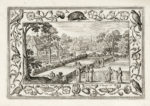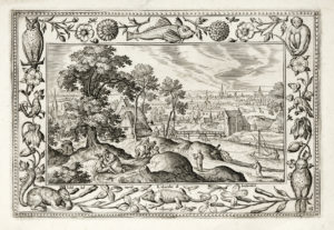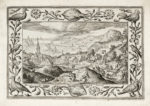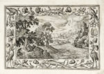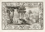 New Hollstein, 448-472. Al margine inferiore "Iohan. bol inve." ed "Eduard ab hoes-winkcel Exc.". Tredici tavole da Paesaggi con scene del Vecchio e Nuovo Testamento e scene di caccia, serie in ventiquattro incisioni entro elaborate cornici decorative con animali e fiori, da soggetti di Hans Bol.