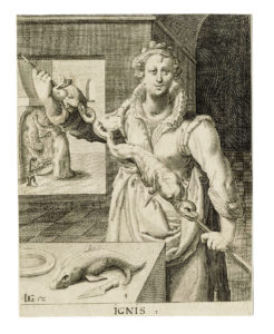 Sulla lastra in basso a sinistra l'excudit e il monogramma di Jacques de Gheyn II, al centro il numero "4", al margine inferiore il titolo. Da una serie dedicata ai quattro elementi, ciascuno rappresentato da un personaggio intento a un'occupazione associata all'elemento raffigurato. L'elemento fuoco è presentato con una sguattera con uno spiedo in mano, sul quale sono infilati una lepre e un uccello. Sullo sfondo una seconda inserviente, intenta a cucinare una pentola accanto al fuoco. Buona prova su carta vergellata priva di filigrana.