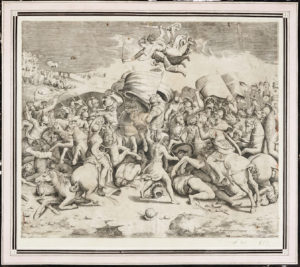 Giorgio Ghisi (Mantova, 1520-1582). La visitazione. Da Francesco Salviati. Bulino. mm 324x508. Bartsch, XV, 1. / Giulio Bonasone (Bologna, 1500/1510 - 1576). La vittoria di Costantino su Massenzio. Bulino. mm 375x445. Bartsch, XV, 84. Buone prove con segno ancora ben leggibile in tirature tarde. (3)
