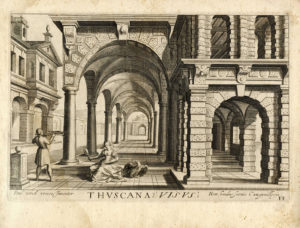 Hendrick HONDIUS I, I cinque sensi con gli ordini architettonici. den Haag : Hendrick Hondius, 1606/1607 [1620]. — Bulino. mm 230/235x347/350 — Foglio : mm 283/303x383/385.
