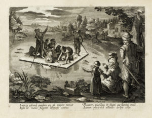 Jan VAN DER STRAET (detto Stradano) [da], La pesca notturna. Antwerp : Phls Galle excud., 1596 e sgg. — Bulino. — mm 195x262. — Foglio : mm 244x330. — New Hollstein, 526.