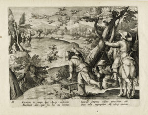 Tre tavole con cacce a diverse specie di uccelli incise da Johann (Jan) Collaert (Antwerp, 1545 ca. – 1628) con la firma in basso sulla lastra.
