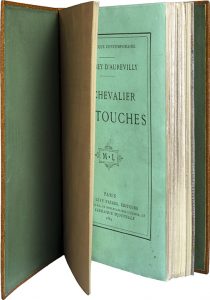 BARBEY D'AUREVILLY (Jules). Le Chevalier Des Touches. Paris, Michel Lévy frères, 1864. In-12, maroquin lavallière janséniste, tranches dorées sur témoins, doublures de veau vert clair encadrées d'un filet doré, gardes de moire mordorée,...