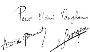 – Dans la rue. Chansons et monologues. Paris, Aristide Bruant, s.d. In-12, broché, non coupé. Édition originale, illustrée par Steinlen. Un des 50 exemplaires sur japon, seul grand papier. – Dans la rue. Deuxième volume. Chansons et monologues. Paris, Aristide Bruant, s.d. In-12, broché, non coupé. Édition originale, illustrée par Steinlen. Un des 150 exemplaires sur japon, seul grand papier. – Sur la route. Chansons et monologues. Château de Courtenay, Aristide Bruant, s.d. In-12, broché. Illustrations de Borgex. Mention de quatrième mille. Envois autographes signés de l'auteur et de l'artiste : Pour l'ami Vaughan. – Sur la route. Chansons et monologues. Dessins de Borgex. Château de Courtenay, Aristide Bruant, s.d. In-12, broché, non coupé. Édition originale, illustrée par Borgex. Un des 150 exemplaires sur japon paraphés par l'auteur et l'artiste, seul grand papier. Rousseurs la couverture.