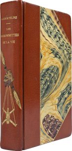 COURTELINE (Georges). Les Marionnettes de la vie. Paris, Ernest Flammarion, s.d. In-12, bradel demi-maroquin orange avec coins, dos lisse orné d'une composition mosaïquée et dorée, tête dorée, non rogné, couverture et dos (Ch. Meunier).