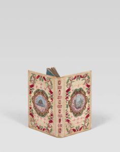 ALMANACH. Etrennes historiques ou mélange curieux pour l’année 1770 contenant plusieurs remarques de chronologie et d’histoire. Ensemble des naissances et morts des rois, reines, princes et princesses de l’Europe, accompagnées d’épopées Avec un Recueil de diverses matières variées, utiles, curieuses et amusantes. A Paris, chez Valleyre, 1770. In-24, veau blanc entièrement décoré de pièces de veau framboise et vert, de petits fers et semis dorés, les parties non d’écrues étant occupées par des rectangles au trait en rouge, les milieux occupés par deux médaillons portant chacun une miniature dans un triple encadrement. A l’intérieur, sous mica, une bordure filigranée de motifs et de semis de pointillé blanc d’une extrême finesse, dos orné et mosaïq. rouge, glace encastrée à l’inter. et bordée de broderie de fil d’or, double. et gardes de tabis bleu ciel, tr. dor., étui cart. à fleurs multicolores (Rel. anc.). EXTRAORDINAIRE RELIURE, REMARQUABLE PAR LA FINESSE DES MINIATURES D’UN PETIT FORMAT et par les couleurs vives des décors qui ressortent particulièrement bien sur le veau blanc. Les miniatures représentent un couple de pêcheurs en barque dans un port avec fond montagneux et la seconde un rocher en pleine mer avec un serpent avec la mention manuscrite à l’encre rouge : « Il est tranquille dans l’orage ». Provenance : - Vente coll. J. Riollot de Boisset, Hôtel Drouot, 24 janvier 1973, n° 15. (mica acc.)