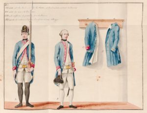 COSTUMES militaires italiens. ORSINI VON ROSEMBERG, (Francesco). Regolamento per l’instituto de’ cadetti del Reggimento Reale di Toscana da stabilirsi nella piazza di Livorno. In Livorno, Vincenzo Falorni, 1769. Petit in-folio de 29 pp. (dont un titre), broché, couverture de papier décoré du temps. L’ouvrage est dédié à S. A. Royale l’Archiduc Pietro Léopoldo, Grand-Duc de Toscane et donne les Règlements militaires des Cadets de Toscane. SUPERBE EXEMPLAIRE enrichi d’une grande aquarelle originale exécutée à l’époque, repliée (355 x 458 mm) représentant deux Cadets de Livourne en pied et grand uniforme, la composition est dans un encadrement de filets à la plu me.