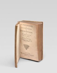 PASCAL (Blaise). Les Provinciales ou les lettres écrites par Louis de Montalte, à un provincial de ses amis & aux RR.PP. Jésuites. A Cologne, Chez P. de la Vallée, 1657. In-18, vélin à recouvr., titre à la plume au dos, tr. dor. (Rel. anc.). Première édition collective et à pagination continue, publiée par Nicole et imprimée par L. et D. Elzevier. Titre, 11ff. d’avertissement, 398 pp. dix-huit lettres; 2e partie: Advis des Curez de Paris, 111 pp. Très joli exemplaire de tout premier tirage, avec la faute « moines mandiants » (page 3) qui devient : « religieux mendiant » dans les exemplaires de seconde émission. (Willems, 1218).