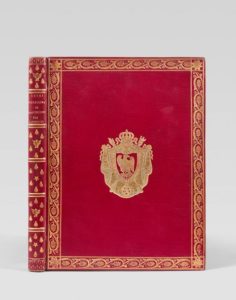 POITEVIN (Jacques). Essai sur le climat de Montpellier. Contenant des vues générales sur la nature et la formation des météores Par Jacques Poitevin, conseiller de Préfecture du département de l’Hérault Montpellier et Paris, Marchant, 1803. Gr. in-4, maroq. rouge à grain long, large dent. à palmettes et armes au centre frappées en or, dos orné d’abeilles, aigles et étoiles, doublé et gardes de tabis bleu, dent. intér., tr. dor. (Bozérian). Edition originale, imprimée sur papier vélin. SUPERBE RELIURE, SIGNEE DE BOZERIAN, AUX GRANDES ARMES DE L’EMPEREUR NAPOLEON Ier, avec semis de ses emblèmes au dos, de la plus parfaite fraîcheur. Provenance : - Bibliothèque du Dr. A. Ripault, vente 1924, n° 88. Ex. cité dans l’Armorial Olivier, pl. 2.652.