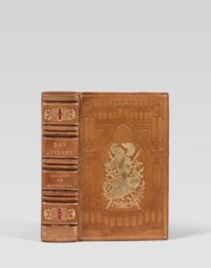 CERVANTES. El Ingenioso Hidalgo Don Quijote de la Mancha, compuesto por Miguel de Cervantes Saavedra. Edition en miniature. P., Didot, 1827. In-18, veau fauve, dos à 3 nerfs orné avec 2 petites pièces de mosaïq. rouge, plats décorés or au centre d’un buste de chevalier en armure avec attributs, encadré d’un décor à froid à la cathédrale, pet. dent. intér., tr. dor. (Simier, rel. du Roi). Première édition minuscule imprimée par Didot et financée par Joaquin Maria de Ferrer. Elle est illustrée d’un portrait de l’auteur, d’un titre- frontispice gravé sur bois, 8 planches hors-texte, une carte à double page des voyages de Don Quichotte, le tout gravé sur acier par Stacker. (Inf. rousseurs). Exemplaire renfermant les figures tirées sur Chine, dans une jolie et fraîche reliure romantique décorée, signée de Simier. Henrich, 79. Ford Lansing, p. 9. Brunet I-1750.