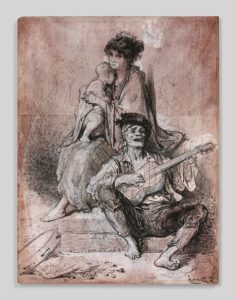 DORE (Gustave) (1832 - 1883). Guitarrero et danseuse ambulante (Séville), 1874. Crayon, plume et lavis de sépia, avec rehauts de gouache blanche, sur bois, signé (à l’envers), en bas à droite. Ce très beau dessin n’a pas été entaillé par le graveur sur bois, il a cependant servi de modèle à un bois du même sujet publié dans « L’Espagne » par le Baron Ch. Davillier à la page 422. Haut. 160 - Larg. 120 mm