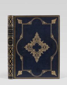 DAVILLIER (Baron Ch.). L’Espagne, illustrée de 309 gravures dessinées sur bois par Gustave Doré. P., Hachette, 1874. Gr. in-4, gel. pleine, maroq. bleu, dos orné, déc. sur les plats, dent. intér., tr. dor. (Hardy). PREMIER TIRAGE : 310 vignettes gravées sur bois, dont 132 à pleine page, sans texte au verso. (Leblanc, pp. 81-82). L’UN DES FORT RARES EXEMPLAIRES SUR PAPIER DE CHINE, DANS UNE PLEINE RELIURE DE L’EPOQUE, SIGNEE, au chiffre de M. Templier, gendre de l’éditeur. Provenance : - Bibliothèque V. de la Fortelle (ex-libris). L’UN DES PLUS BEAUX LIVRES ILLUSTRES PAR GUSTAVE DORE. PROBABLEMENT UNIQUE EN CES CONDITIONS.
