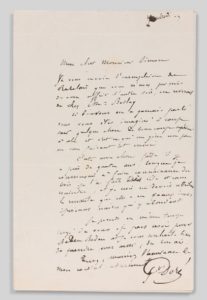 RABELAIS (François). OEuvres, contenant la vie de Gargantua et celle de Pantagruel, augmentées de plusieurs fragments et de deux chapitres du Ve livre restitués d’après un manuscrit de la Bibliothèque Impériale [...]. Illustrations par Gustave Doré. Paris, J. Bry aîné, 1854. Grand in-8, demi-maroquin grenat avec coins, dos à nerfs orné aux petits fers, entièrement non rogné, couverture illustrée et dos conservés (Noulhac). Premier tirage. Frontispice, 14 planches hors-texte et une centaine de vignettes dans le texte gravées sur bois d’après Gustave Doré. Une des premières et des meilleures illustrations de Gustave Doré, qui prélude dans le même esprit aux Contes drôlatiques publiés l’année suivante. Superbe exemplaire avec sa très belle et fragile couverture générale blanche illustrée imprimée en rouge, vert et or, «fort rare en bon état» (Carteret, III, p. 511), conservée, complète du dos, à l’état de neuf. Il renferme les sept couvertures de livraisons, chacune illustrée d’une vignette différente. Il est enrichi de 1 l.a.s., adressée à M. Simon, s.d., vendredi (158). 1 p. gr.in-8. Jolie lettre à propos de son Rabelais dont il offre un exemplaire à son correspondant : « Si l’on vous en a jamais parlé, vous vous êtes imaginé à coup sûr quelque chose de beaucoup supérieur C’est une chose faite il y a près de quatre ans, lorsque je commençais à faire connaissance avec le bois, je l’ai faite très vite et sans craindre, et je ne crois devoir attribuer la réussite qu’elle a eue qu’aux inexpériences naïves qui y abondent » Provenance : - Bibliothèque Mercier (ex-libris).