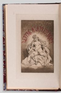 GAUTIER (Théophile). Lettre à la Présidente. (Voyage en Italie), 1850. P., s. d. (1890). In-12, Bradel demi-chagr. grenat, n. rogné, couv. cons. (Cart. du temps). Edition originale imprimée anonymement, tirée à un très petit nombre d’exemplaires sur japon Impérial. Ouvrage illustré d’un frontispice érotique de Félicien Rops sur chine et imprimé en trois tons (Exsteens, 743). La Présidente, surnom honorifique attribué à Apollonie Sabatier, pseudonyme d’Aglaé Savatier, fût l’une des maîtresses de Salon les plus envoûtantes du XIXe siècle. Elle inspira un amour éthéré à Baudelaire qui composa pour elle ses plus mystiques poèmes des Fleurs du Mal. Les autres artistes qui fréquentaient l’appartement de la rue Frochot, lors de ses célèbres dîners dominicaux, éprouvaient pour cette femme étonnante d’esprit et de beauté, des sentiments plus licencieux. Le sculpteur Clésinger la représenta ainsi à travers sa lascive « femme piquée par un serpent » ; Flaubert lui écrivit des lettres sensuelles qui se concluent par « l’affection bien sincère de celui qui ne vous baise, hélas, que les mains », tandis qu’elle passa longtemps pour avoir été le modèle de l’Origine du monde de Gustave Courbet. « En octobre 1850, Gautier lui adressa de Rome [cette] très longue lettre, bouffonne et obscène, commentant avec une truculence rabelaisienne ce que son ami Cormenin et lui-même avaient appris, en matière de sexualité au cours du voyage qu'ils accomplissaient alors. Gautier savait que sa liberté d'expression n'offusquerait pas Madame Sabatier. Il l'y avait habituée depuis longtemps et se flattait d'égayer par ses « saloperies » les raouts amicaux de la rue Frochot. » (Dictionnaire des oeuvres érotiques). Galitzin, 198 ; Dutel, I, 456, p. 192.