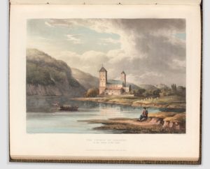 GERNING (Baron J. J. von). A Picturesque Tour along the Rhine From Mentz To Cologne. Londres, Ackermann, 1820. Grand in-4° , maroq. violet, dos orné, sur les plats double encadr. de fil. et dent. dorés avec motif d’angle, titre en lettres dor. au centre du 1er plat, tr. dor. (Reliure de l’époque). PREMIERE EDITION EN ANGLAIS. Superbe et rare ouvrage, illustré d’une carte coloriée du cours du Rhin et de vingt-quatre splendides vues de villes, sites et châteaux d’après G. Schuetz et aquarellées avec le plus grand soin. Vues de Coblentz, Cologne, etc « La plus belle suite sur le Rhin » (P. O. Rave, Rhein bilder der Romantik, 1924). Exemplaire très frais de coloris et d’une parfaite fraicheur, dans une très belle reliure romantique, à l’état de neuf. (mors fendu). Schmitt 84 ; Abbey 217 ; Tooley 234.